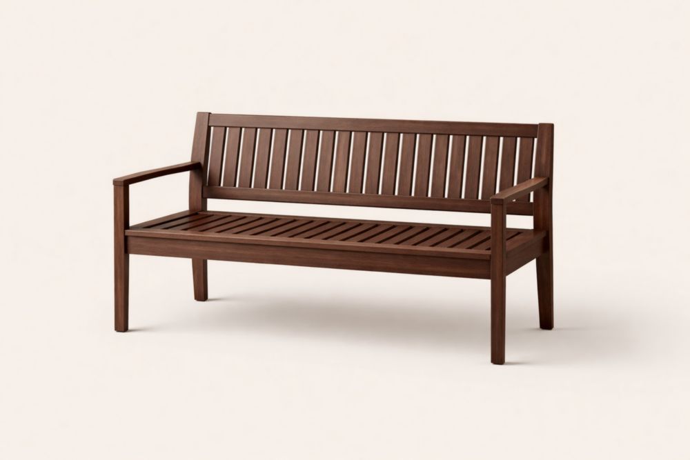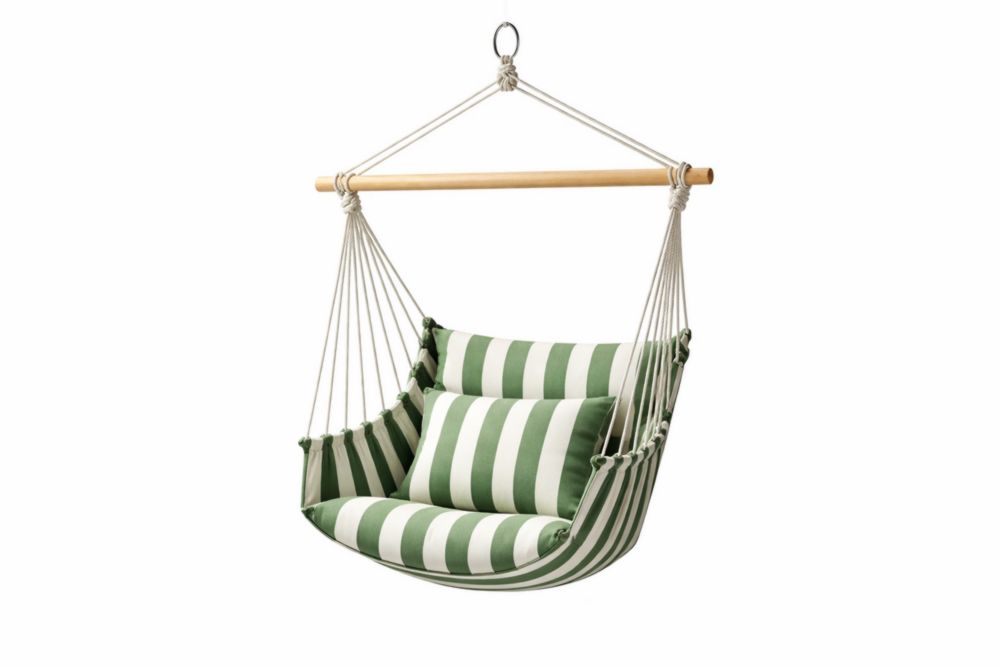 La chaise hamac est faite de coton avec une structure en bois massif. Le tissu est rayé vert et blanc, conçu pour un usage extérieur.